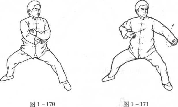 口令2(图1 -170、171) 身体向右转,重心快速移至左腿,同时左掌变拳,快速向左侧发