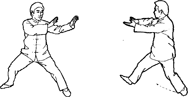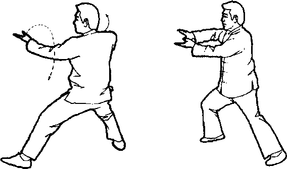 口令1(图1 - 172) 身体稍左转,同时左拳变掌外旋与肩同高,右手内旋至左胸前。
