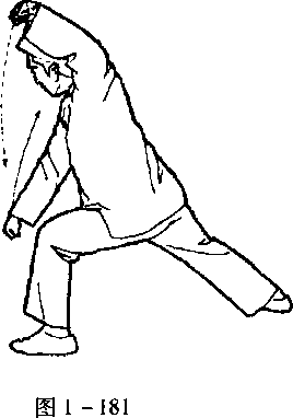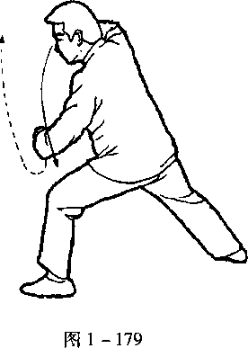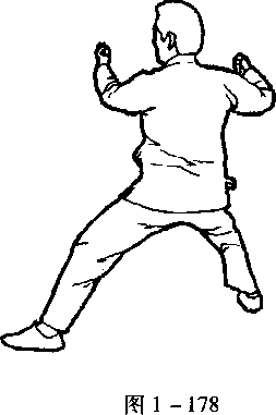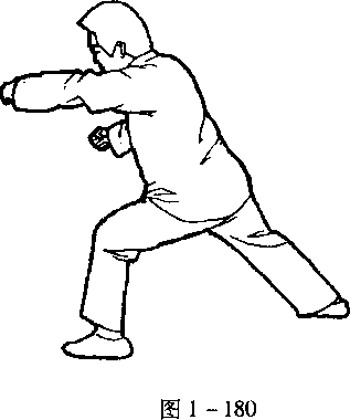 口令4(图1 -178至181) 身体左转,重心移至左腿,同时左掌变拳外旋先向下划弧后上