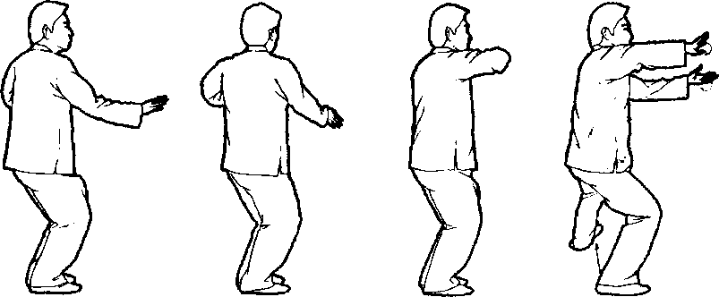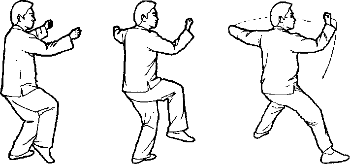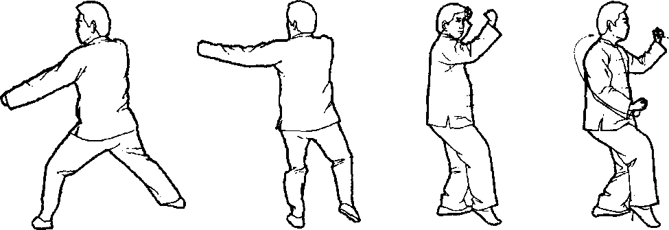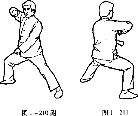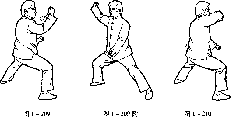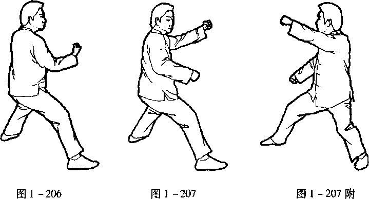 口令4(图1 -206、207、208) 重心右移,左拳内旋收于左前方,右拳向下向外内旋置于右