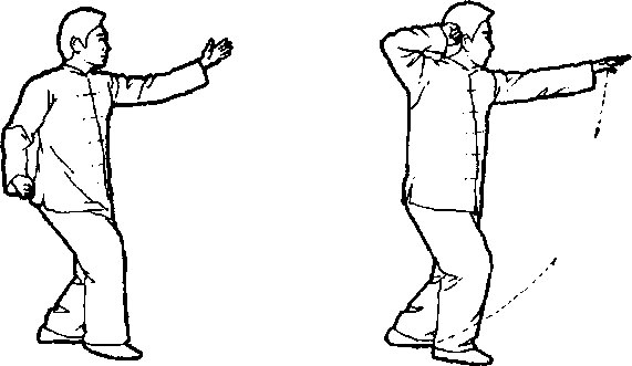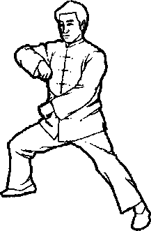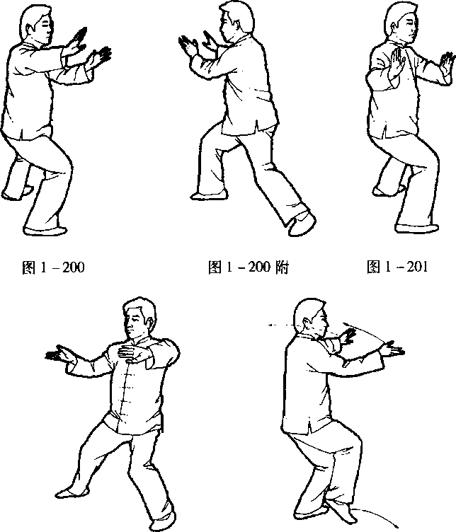 口令2(图1 -200、201、202) 重心左移,提右脚收于左脚内侧,右脚尖点触;孱明8手通