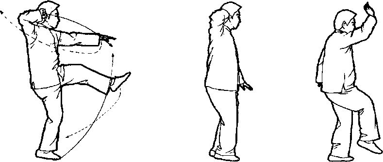 要点:两足虚实转换要分清,胸腰折叠和踢腿要协调一致。
