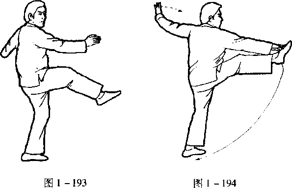 口令4(图1 -190至195) 右脚踏实,左腿向上抬起,随即下落,右脚迅速蹬地跃起,伸平 脚面向上踢起,同时右拳变掌由后向前、向上与右脚面迎击,左拳变掌向下划弧经身后至左侧,右 脚下落至左脚内侧。(面向东)