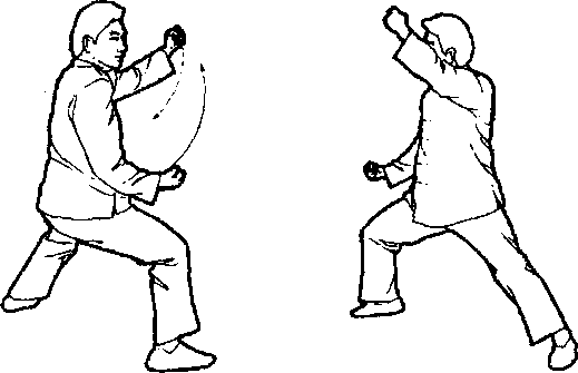 部右侧,再由上向下屈臂下沉与左拳相合,拳眼向上。