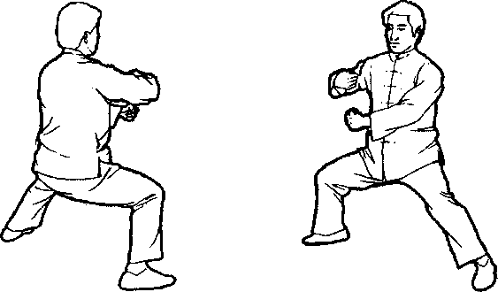 拳于左侧上方略高于肩,右拳于右胸前,拳心向里。
