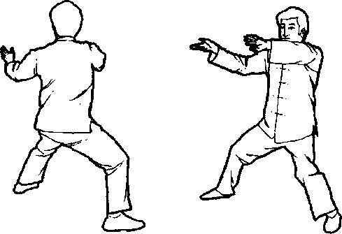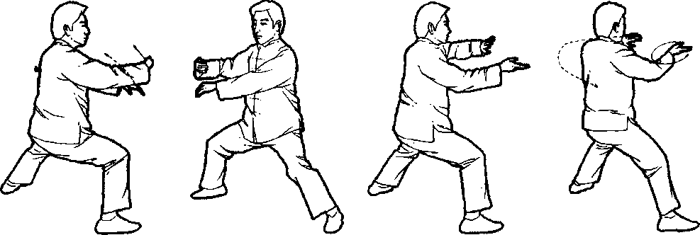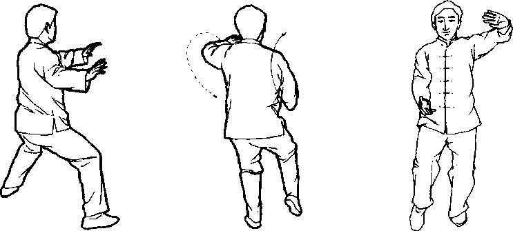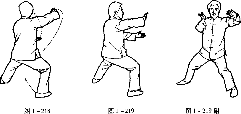 口令4(图1 -219、220、221) 重心左移,提右脚收于左脚右前方,脚尖点地,同时两手向