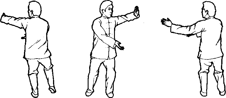 要点:前招、后招主要是左右旋腰转背和旋踝转膝。在上下左右旋转时,必须周身相随,节节贯串,一动全动。在“前招” 身体向左旋转时,注意松左髓,沉右肩,左膝与右膝相合;“后招”身体向右旋转时,注意松右髓,沉左肩,两膝相合。