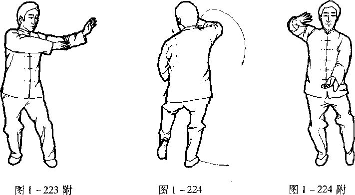 口令(图1 -222、223、224) 重心移至右腿,左脚尖点地,同时双手由左向下、向右划弧运