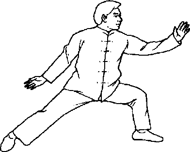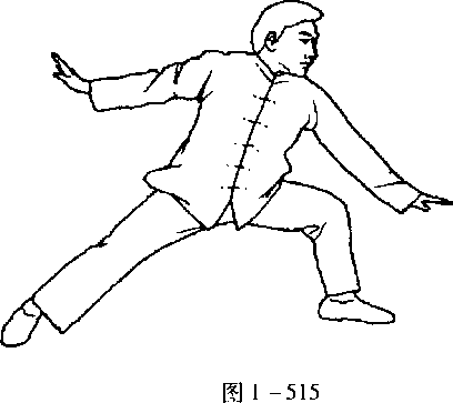 口令5(图1 -523、524、525) 重心移至左腿,提右脚向右横开一步,脚跟着地;同时双手
