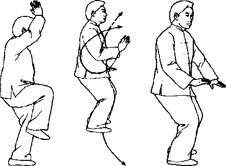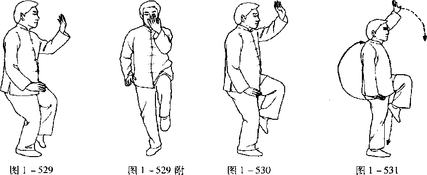口令3(图1 -518、519、520) 提右腿,脚尖自然下垂。右手由下经左臂内向上托起,同时