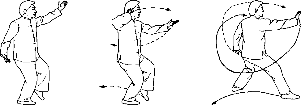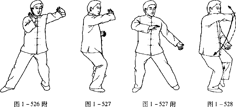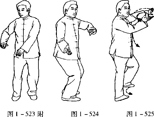 口令6(图1 -526.527.528) 重心移至右腿,身体先左转再右转,随即提左脚收于右脚内