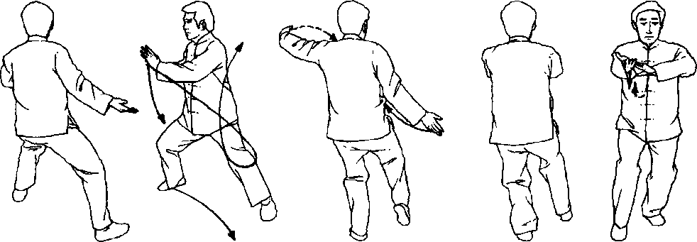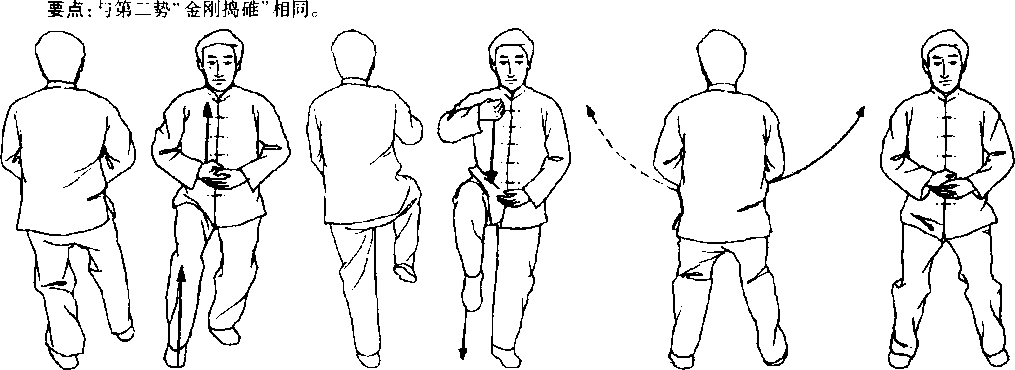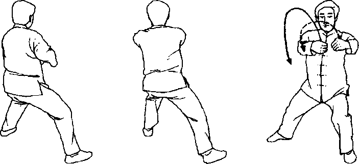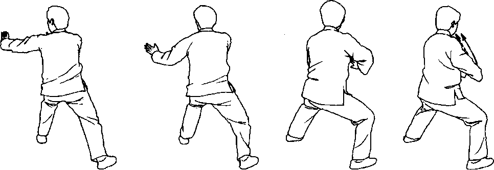 要点:双摆后,右足向右后伸,双掌向左前微按,要有上、下配合之意,同时完成。双拳向左前方发劲时,需先将向后捋的 身法调整过来,再向前发,并且运用的是抖劲,这更需要上下配合恰当、松活、弹抖,才能将劲发于双拳。