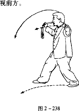 口令3(图2 -238、239) 右脚向前迈一步落地,随即重心移至右腿,左腿屈膝抬起。同时