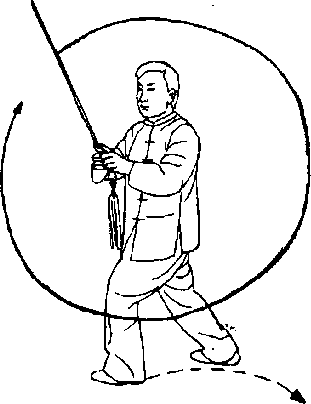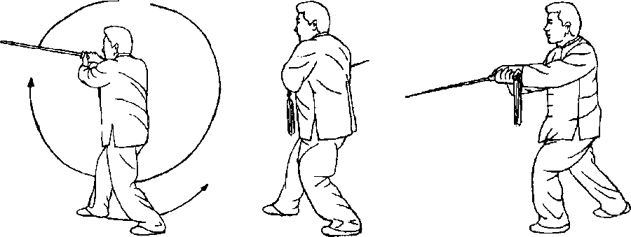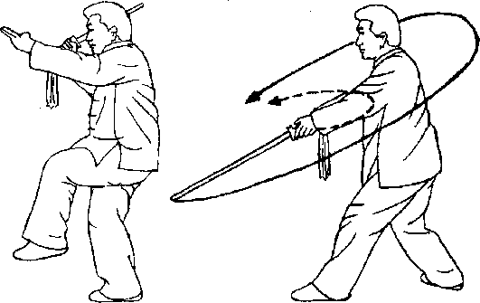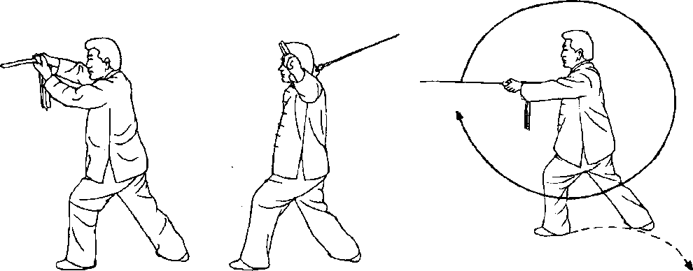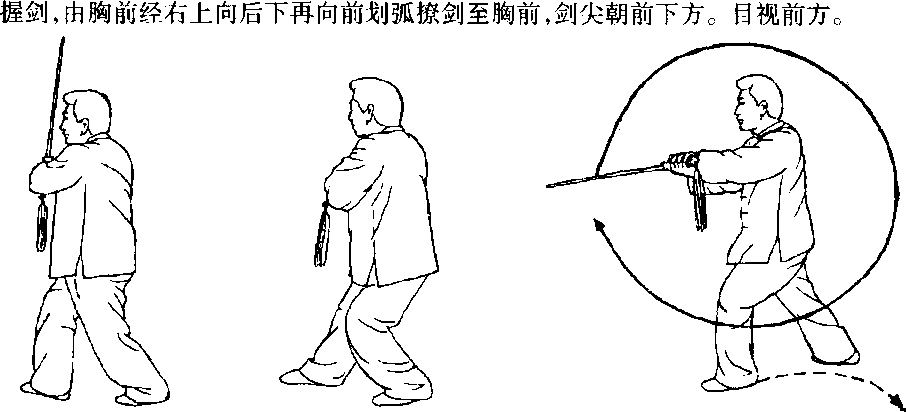 地。同时两手握剑由胸前向左上经后下方,再向右上划弧撩剑至胸前。走上弧向后撩剑时,身体