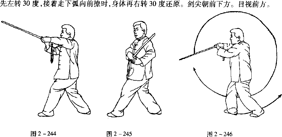 口令2(图2 -243) 重心移至左腿,成左弓步。同时右手握剑从身体右侧上方向前弧线
