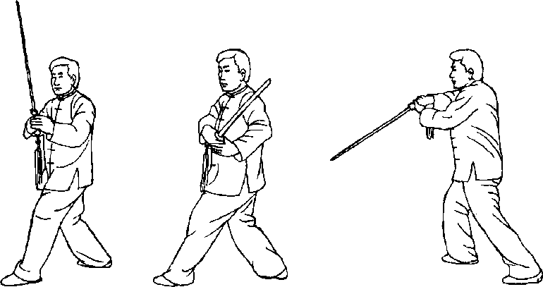 前相合握住剑柄,用腕力向前下方点刺。目视剑尖。(身朝正西)