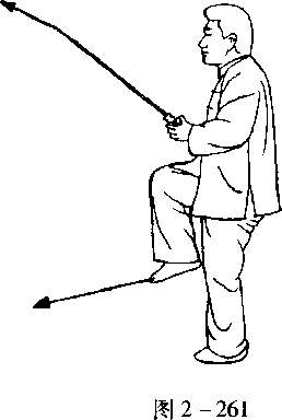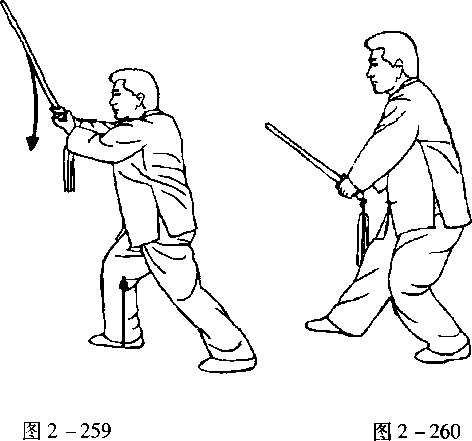 口令 2(图 2 -259、260、261) 重心 移至左腿,随即右腿屈膝抬起。同时两手握 剑使剑尖经前上方划弧下沉收于胸前,剑尖 朝前上方。目视前方。