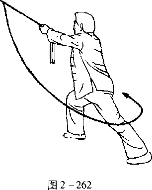 口令4(图2 -263、264.265) 身体左转90度,重心微向右移。同时两手握剑迅速折腕, 由右上方经下向左划弧摆至身体左前方后,重心移至右腿,两手握剑后收于腹前,剑尖朝左前下 方。目视剑尖。
