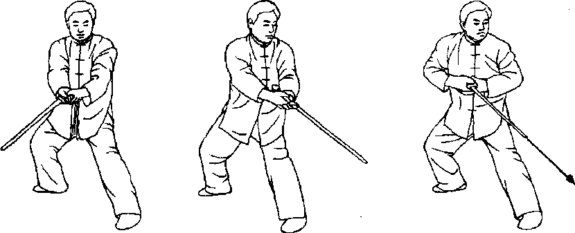 要点:扭腰转胯,旋臂折腕,动作要迅速。刺剑时,随重心前移,塌腰松胯,劲贯剑尖C