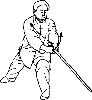 左下方刺剑。剑尖朝左前下方,目视剑尖。(身朝东南)