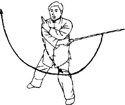 要点:剑右上斜抹时,必须随重心移动,塌腰转体,劲达剑刃。