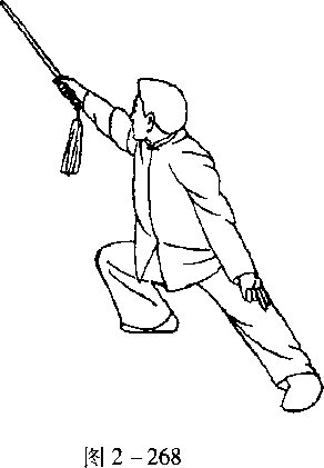 口令2 (图2 - 268) 身体右转45度,重心移至右腿成右 弓步。同时左手剑指下分至左膝上方,剑指朝左下方,剑指手心 朝前上方。右手握剑由左向右经腹前向上,用剑外刃向右上方 斜抹,高于肩,剑尖朝右上方。目视剑尖。(身朝西南)