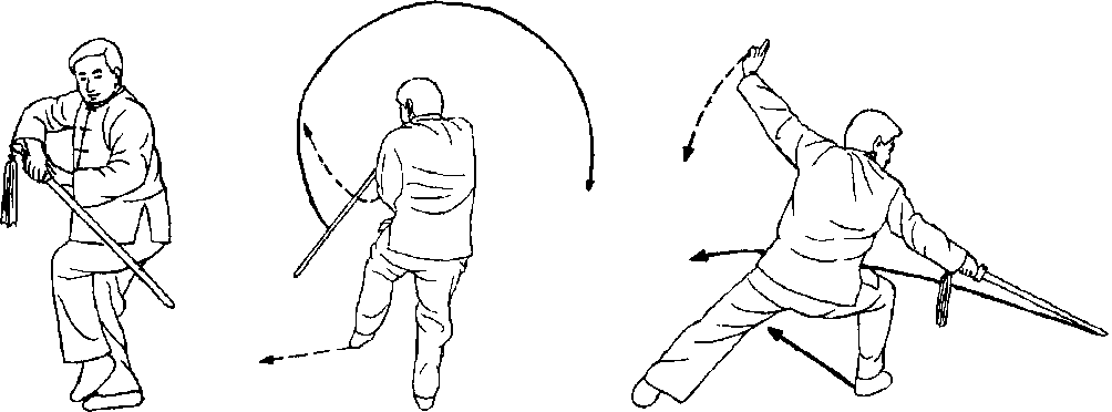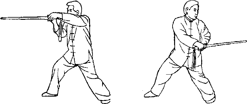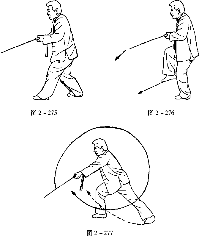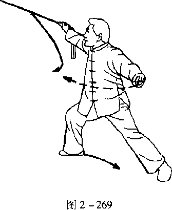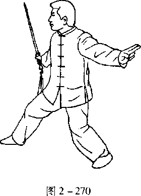 口令1 (图2 - 278 .279) 接上势。身体左转90度,重心移于左腿,同时右手握剑、左手随 剑,经上向左划弧至外侧,剑尖朝后,目视后方。