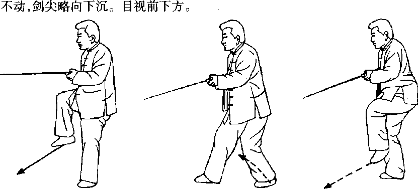 口令4(图2 -277) 右脚向右前方迈一大步落地,随即重心移至右腿成右弓步,同时两 手握剑向前下方斜刺,目视剑尖。(身朝正西)