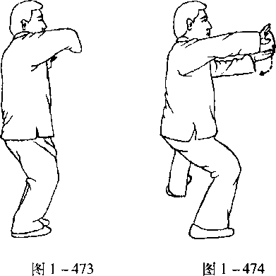 口令4(图1 -478至480) 两掌变拳,拳心相对,两脚突然跳震分开,身体下沉。左拳向