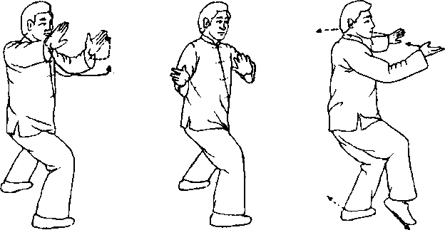 地,同时双手掌心向外,上划运至身体右侧。