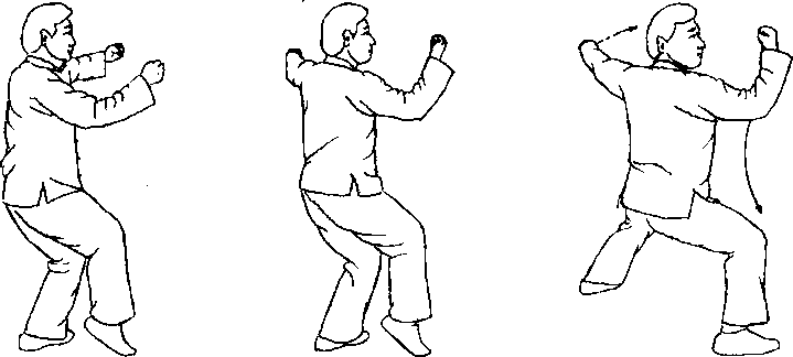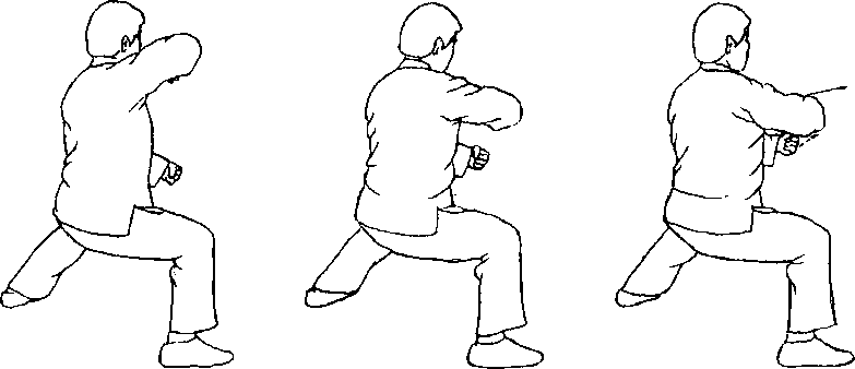 要点:1.此势要求里外缠丝的成分多些,并要求在里外动作之中来达到节节贯穿、周身一家。与前比较,这是需要进一 步练习的。这一拳势是易于明显地表现出一动全动的要求的。此势背要圆。