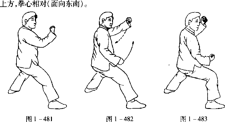 口令5(图1 -481、482) 身体右转,重心左移,同时左拳向上划弧至左侧上方,右拳向下