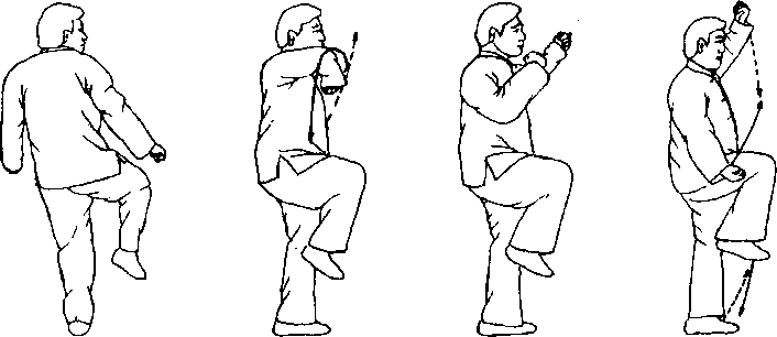 要点:1.蹬后的右腿不落地。由于两拳顺缠后收回,带动右腿收回;在收回的过程中,由于两拳左向前、右向后的双翻, 使收回的右腿和独立的左腿稳定下来。要求顶劲上领,气向下沉,垂肩垂肘。