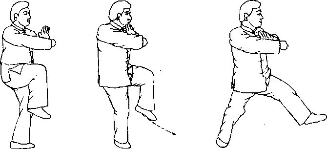 口令3(图1 —522) 重心移到左腿,右腿上步体前交叉,脚尖外摆,同时两掌相合于胸