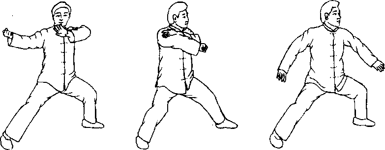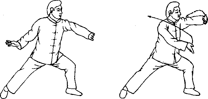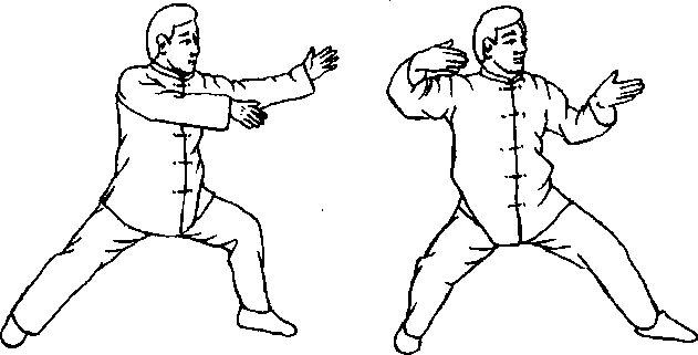 要点:1.此势的动作要一连串、毫不停留地完成,目的在于顺着腰劲以给之,也就是顺着腰的方向,不予顶抗。在最后的 动作,须在不停留的过程中,重心左移,弓左腿,两掌合到终点,迅速向左方一击,此时应注意两掌的掌根。