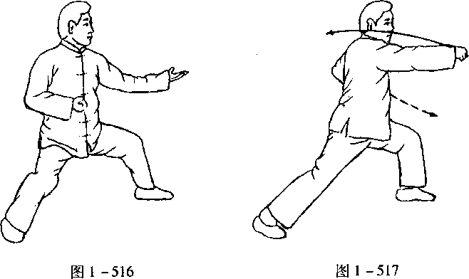 口令3(图1 -513至517) 动作要领同第十四势“掩手肱拳”(面向东南)。要点:1.蹬后的右腿不落地。由于两拳顺缠后收回,带动右腿收回;在收回的过程中,由于两拳左向前、右向后的双翻, 使收回的右腿和独立的左腿稳定下来。要求顶劲上领,气向下沉,垂肩垂肘。2,此势在转身蹬脚之后,转为两手上下翻转地合住劲;合住两手一分,产生开劲;分后两手紧接着上举和两掌上 托,如捧住篮球跃起,并向篮内投球一样,这样可将身体领起来。口令3(图1 -513至517) 动作要领同第十四势“掩手肱拳”(面向东南)。要点:1.蹬后的右腿不落地。由于两拳顺缠后收回,带动右腿收回;在收回的过程中,由于两拳左向前、右向后的双翻, 使收回的右腿和独立的左腿稳定下来。要求顶劲上领,气向下沉,垂肩垂肘。2,此势在转身蹬脚之后,转为两手上下翻转地合住劲;合住两手一分,产生开劲;分后两手紧接着上举和两掌上 托,如捧住篮球跃起,并向篮内投球一样,这样可将身体领起来。图 1 -513图 1 -513图 1 -514图 1 -514图 1-515图 1-515
