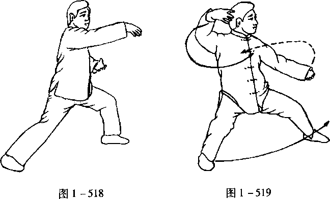 口令1(图1 -518、519) 身体右转,重心右移,同时两拳变掌,掌心相对,左下右上,快速