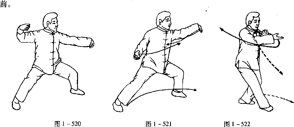 口令2(图1 -520、521) 身体稍右转,重心左移,同时左掌外旋向上划弧,右掌内旋向下 划弧。