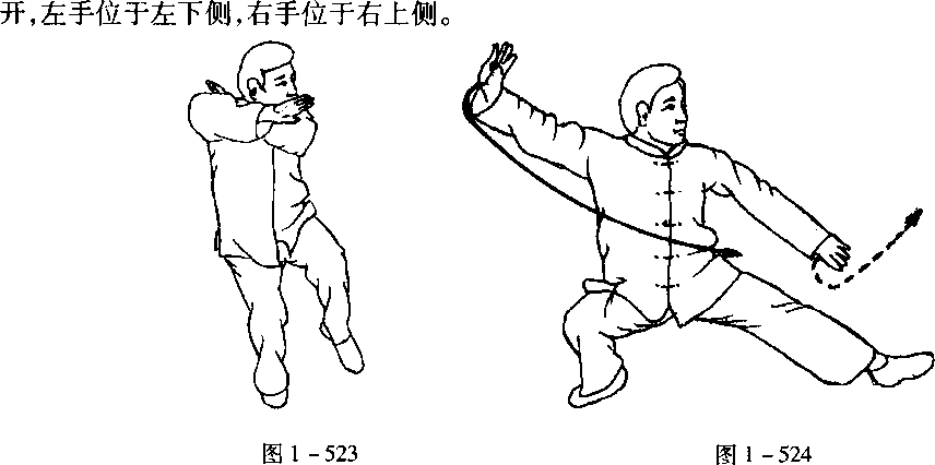 口令4(图1 -523、524) 重心移至右腿,左腿向左侧上一大步,同时两手左下右上划弧分