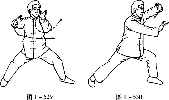 口令6(图1 -527、528、529) 身体右转,重心移至右腿,同时双手随身体转动,向上划弧