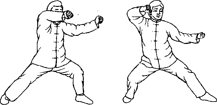 弧,左拳置于左腿内侧,右拳置于身体右上方,拳心相对(面向南)。