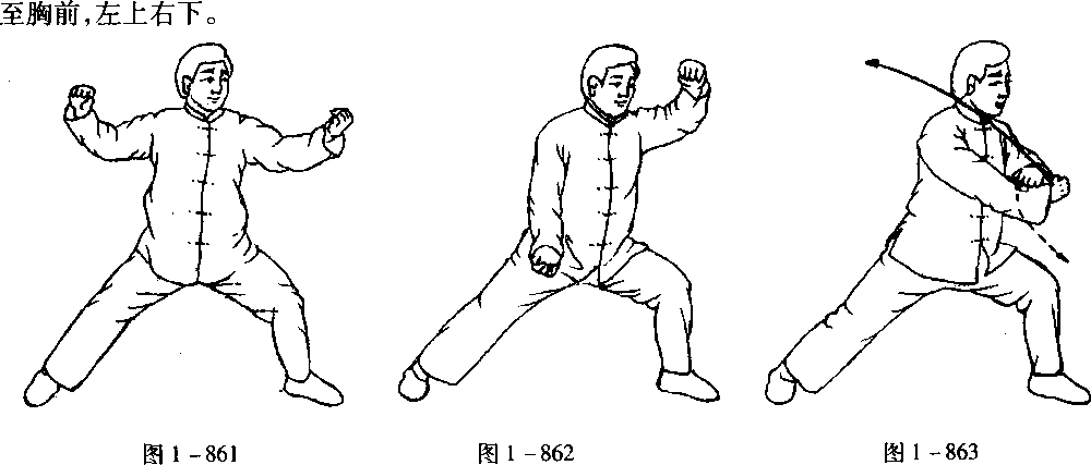 口令3 (图1 -861、862、863) 身体左转,重心移至左腿,同时双拳左上右下划弧交叉合