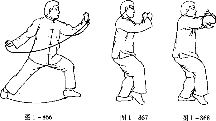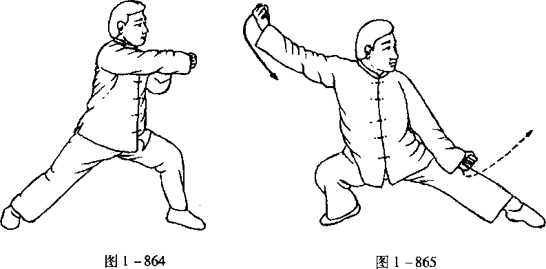 口令4 (图1 -864、865) 身体右转,重心移至右腿,右腿屈膝下蹲,同时双拳左下右上划