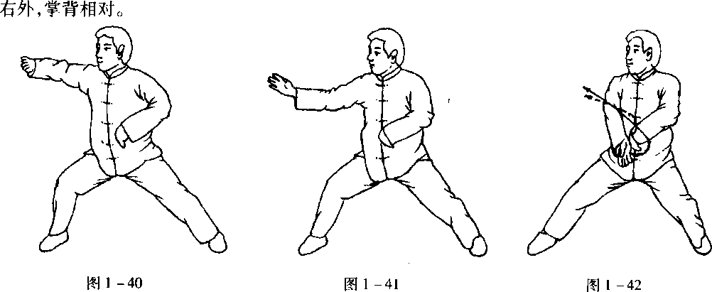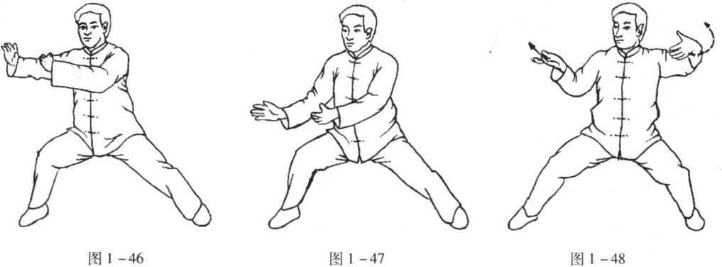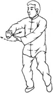 要点:动作一中,两手在身右各翻转一个整圈时,须运用腰脊作轴来带动,才能做得圆劲洒脱。该动作以左脚跟落地为 实,但要注意“虚”非全然无力,“实”非完全站煞。 ,