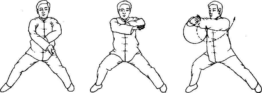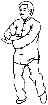 身体右转,重心左移,同时左手外旋右手内旋,收于腹前交叉,