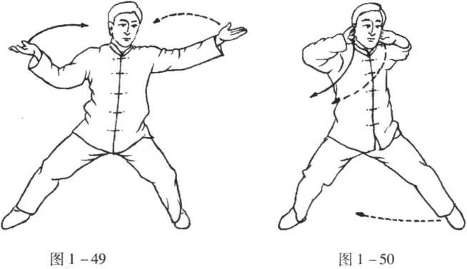口令 4(图 1 -49)口令 5(图 1 -50)口令 4(图 1 -49)口令 5(图 1 -50)身体左转,双手外分,掌心向上。身体左转,重心右移,双手上合至两耳旁O身体左转,双手外分,掌心向上。身体左转,重心右移,双手上合至两耳旁O口令 6(图 1 -51)口令 6(图 1 -51)身体右转,重心移至右腿,左腿收回至身体左侧,脚尖点地,双手下按身体右转,重心移至右腿,左腿收回至身体左侧,脚尖点地,双手下按于身体右侧。要点:两手由合转开或由开转合,都要以腰脊为轴(身体的转动)来带动;在左右转动时上体仍须竖直,不要前俯后仰;两 掌下按时,要气贴脊背,裆口圆虚,以右手为主,左手为辅。两手下按时,悠缓呼出一口深长之气,这对调整呼吸系 统有极大帮助。于身体右侧。要点:两手由合转开或由开转合,都要以腰脊为轴(身体的转动)来带动;在左右转动时上体仍须竖直,不要前俯后仰;两 掌下按时,要气贴脊背,裆口圆虚,以右手为主,左手为辅。两手下按时,悠缓呼出一口深长之气,这对调整呼吸系 统有极大帮助。图 1 -51图 1 -51