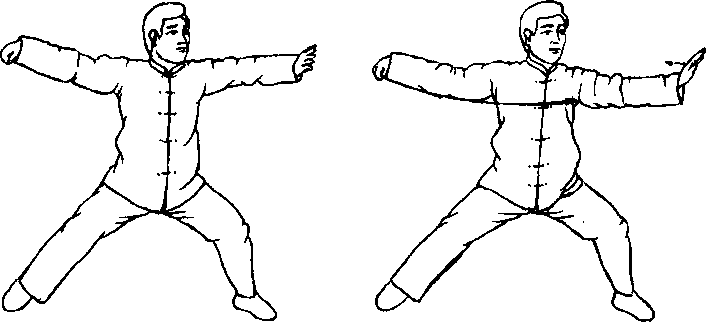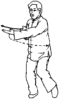 身体右转,双手内旋,左掌前伸,右掌里合,两掌心向上。