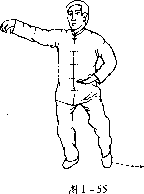 口令3(图1 —56) 身体稍左转,左脚向左开一大步,脚跟着地。