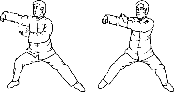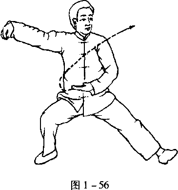 2.此势充分表现了上下(手与足)相随的关系。划一个圈转到上搠时,手为虚,手下的脚就变为实,反之则为虚。 这也是求得内劲中正的关键。(但提腿独立者除外。一足站立,为了保持中正,平衡重心,站立的独足是实,实 足之上的手仍然要实)