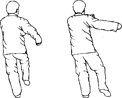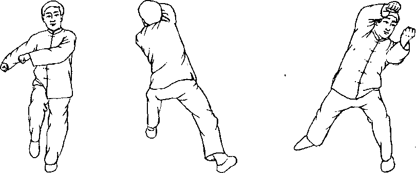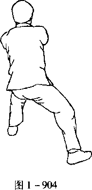 口令3 (图1 -902、903、904) 身体左转,重心左移,同时双拳由上向体前发力,拳心相